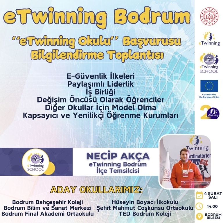 Kurumumuz dahil olmak üzere eTwinning Okulu olmaya aday olan okullar Bodrum Bahçeşehir Koleji, Bodrum Final Akademi Ortaokulu, Hüseyin Boyacı İlkokulu, Şehit Mahmut Coşkunsu Ortaokulu ve TED Bodrum Koleji'ne başvuru süreçlerinde başarılar dileriz.
